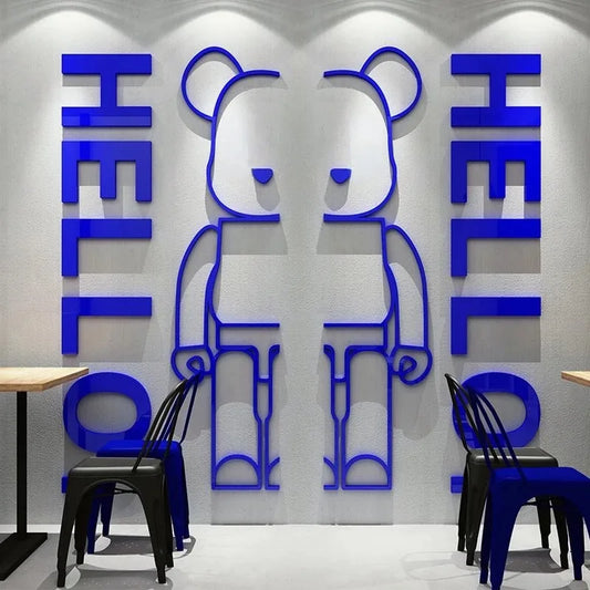 Cartoon Bearbrick Acrylic 3D Wall Sticker with Hello Letter - DIY Cute Panda Solid Mirror Wall Decal Wallpaper Bedroom Home Decor