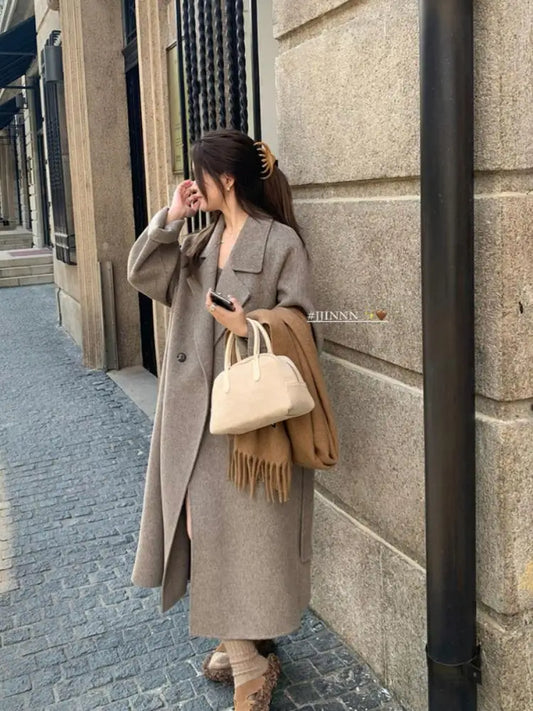 Handmade Office Lady Double-Breasted Woolen Alpaca Jackets 2024 Autumn And Winter Lace Up Loose Long Women's Wool Coats