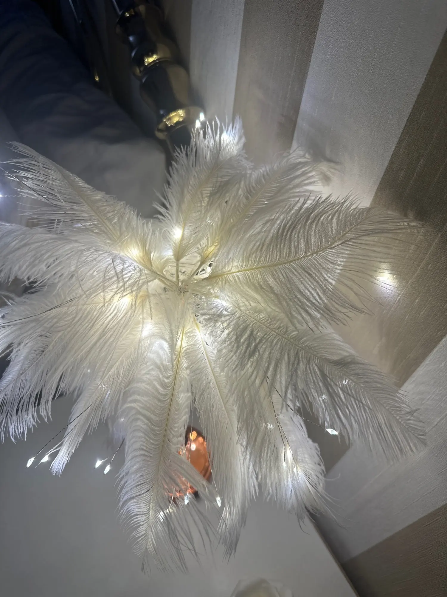 Received the goods completely crushed, fortunately my order summer not damaged. I am a little disappointed by the size of the feathers which are not as large as in the photos of the site the foot of the lamp is in plastic