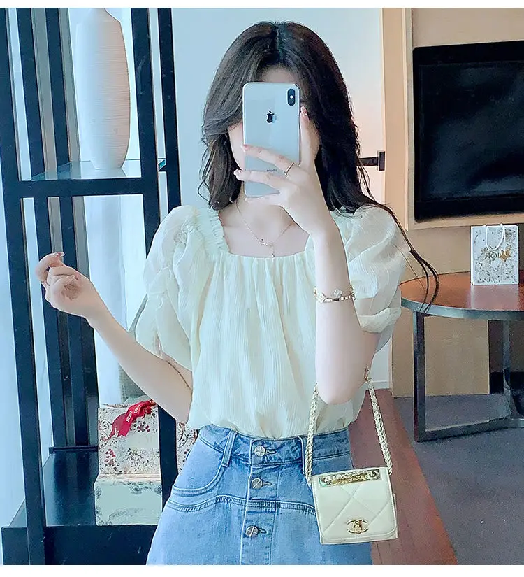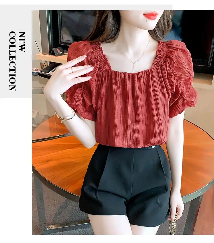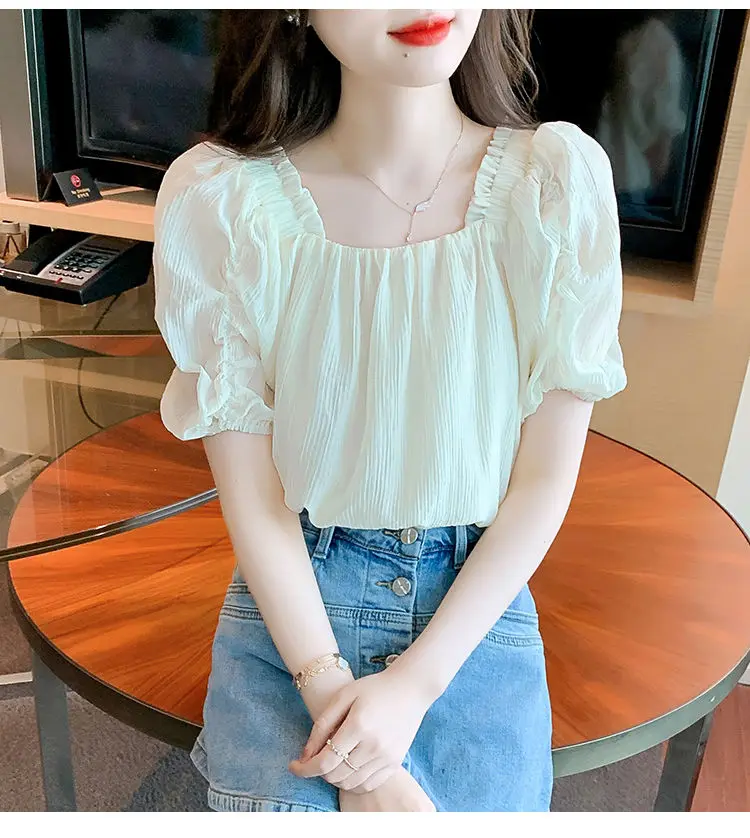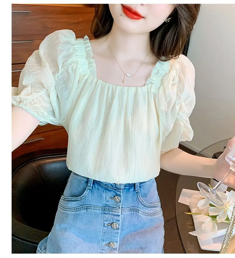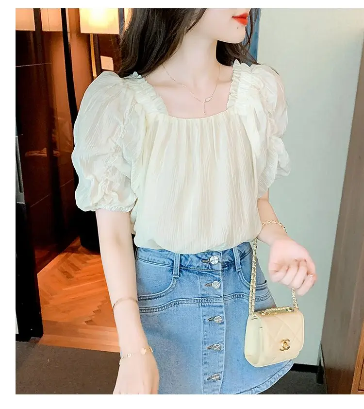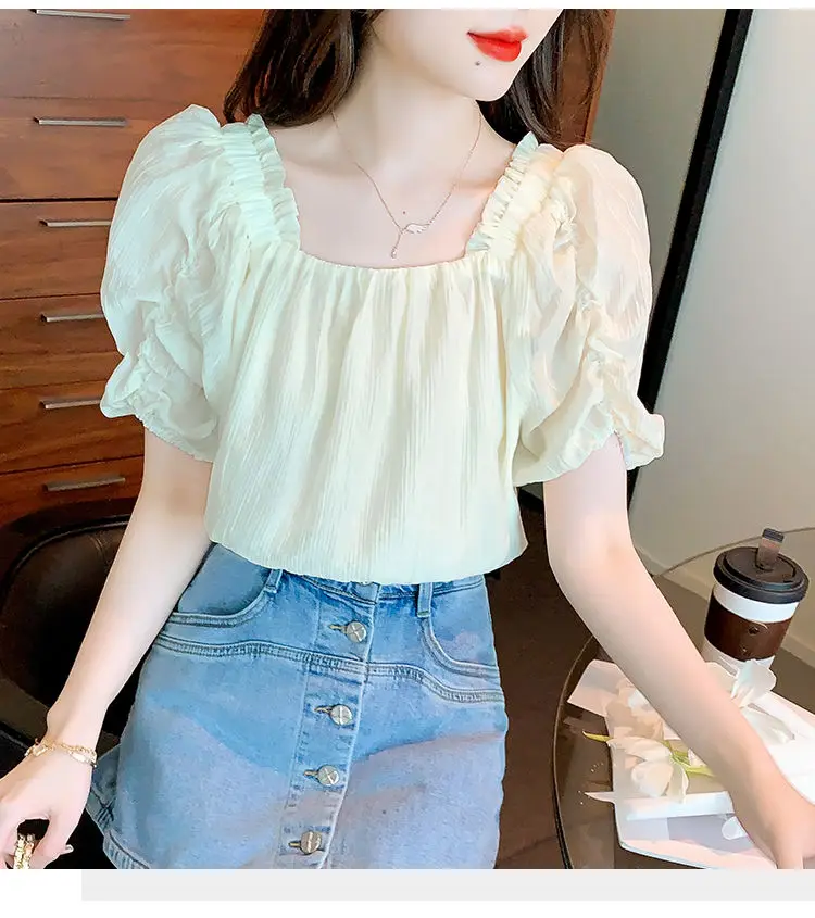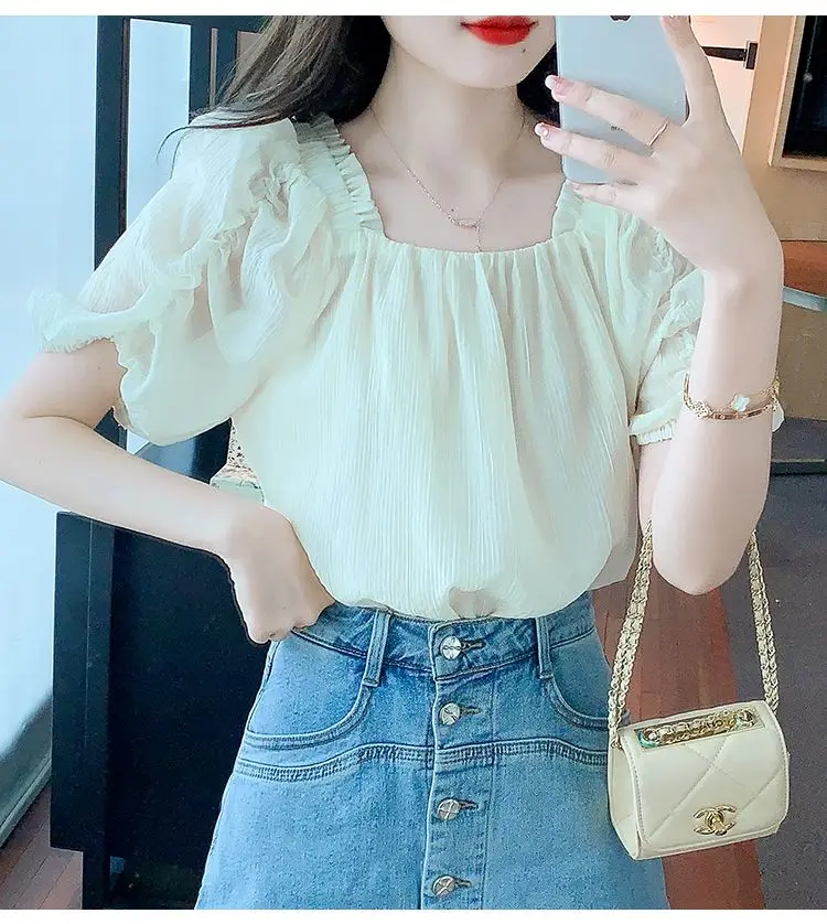 Retro Ruffle French Bubble Sleeve Chiffon Blouse Women Off-Shoulder Sweet Fresh Shirt