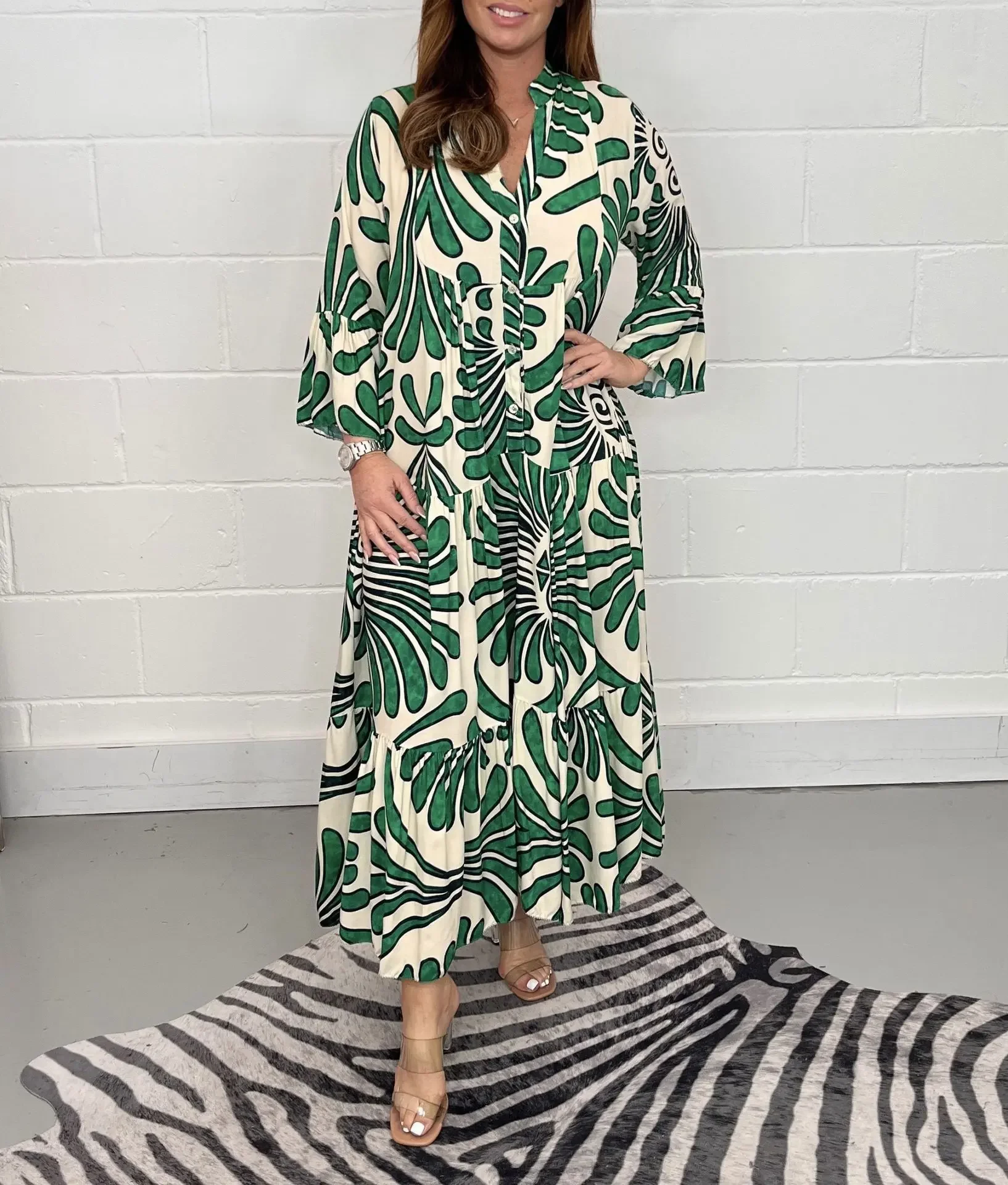 Spring Summer Hot Sale Of The Season Casual Ladies Print Loose Fit V-neck Knee-length Dress Wide Sleeve Women's Fashion Cross-bo