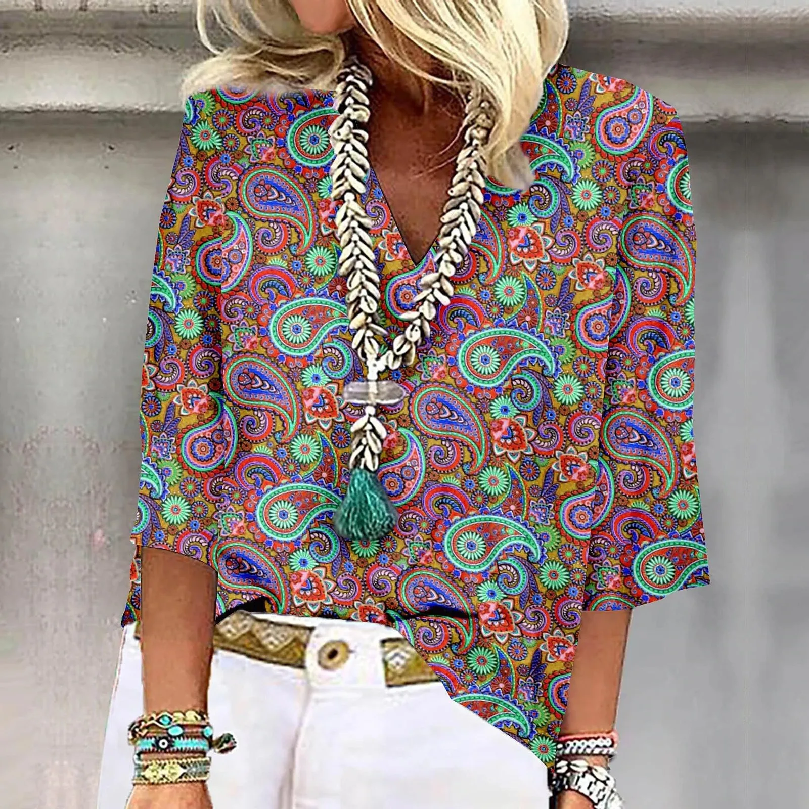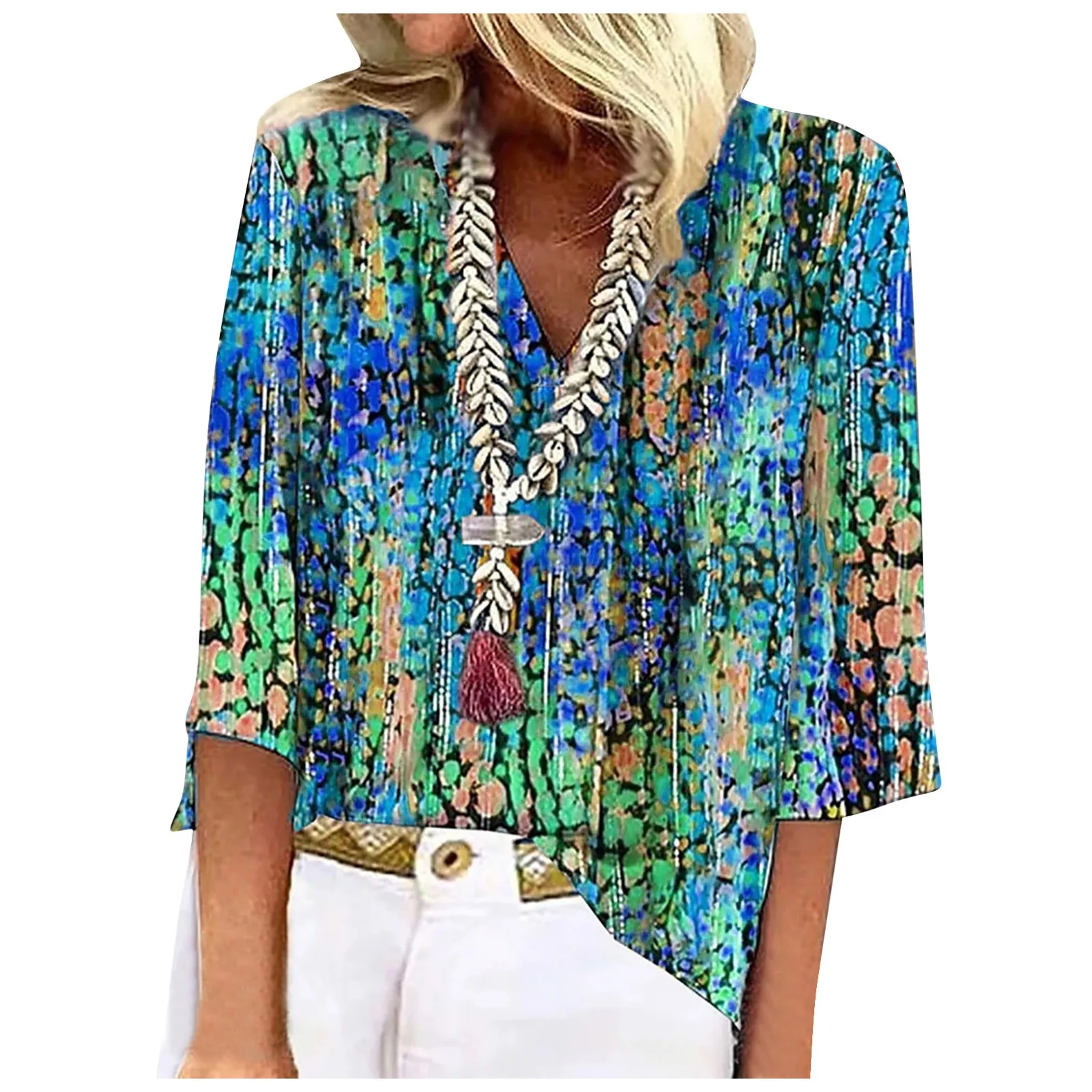 Women's Shirt Blouse Loose Shirts 3/4 Sleeve Print V Neck Tops Print Tops T-shirts Tee Tops for Women Womens Tops and Blouses